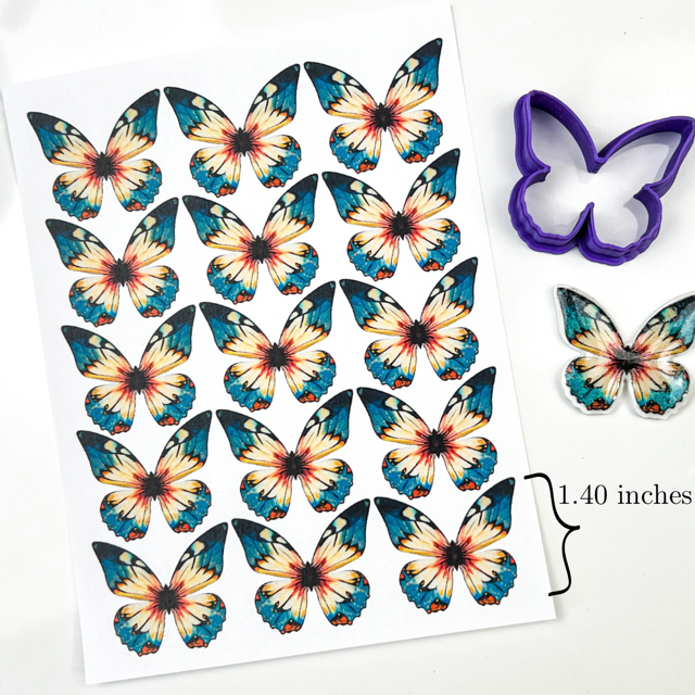 Transfer paper will have 15 butterflies with matching cutter. Cutter is approx 1.40 inches at furthest points.